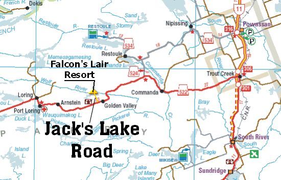 From Hwy. #11 coming from north or south, head west on Hwy. #522, 40 kilometers to Jack's Lake Road.